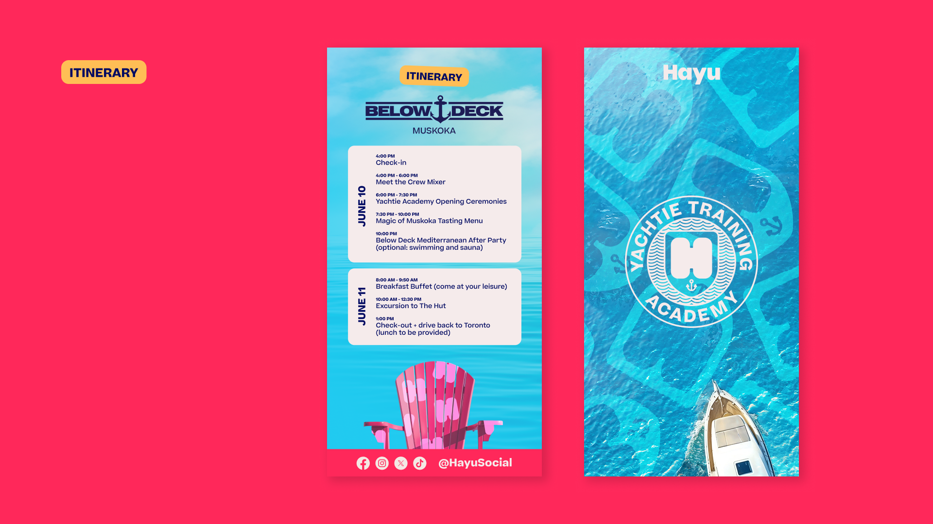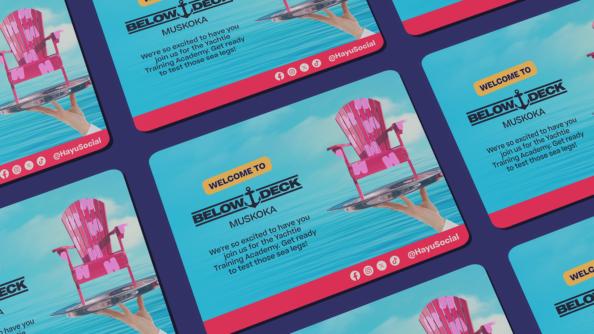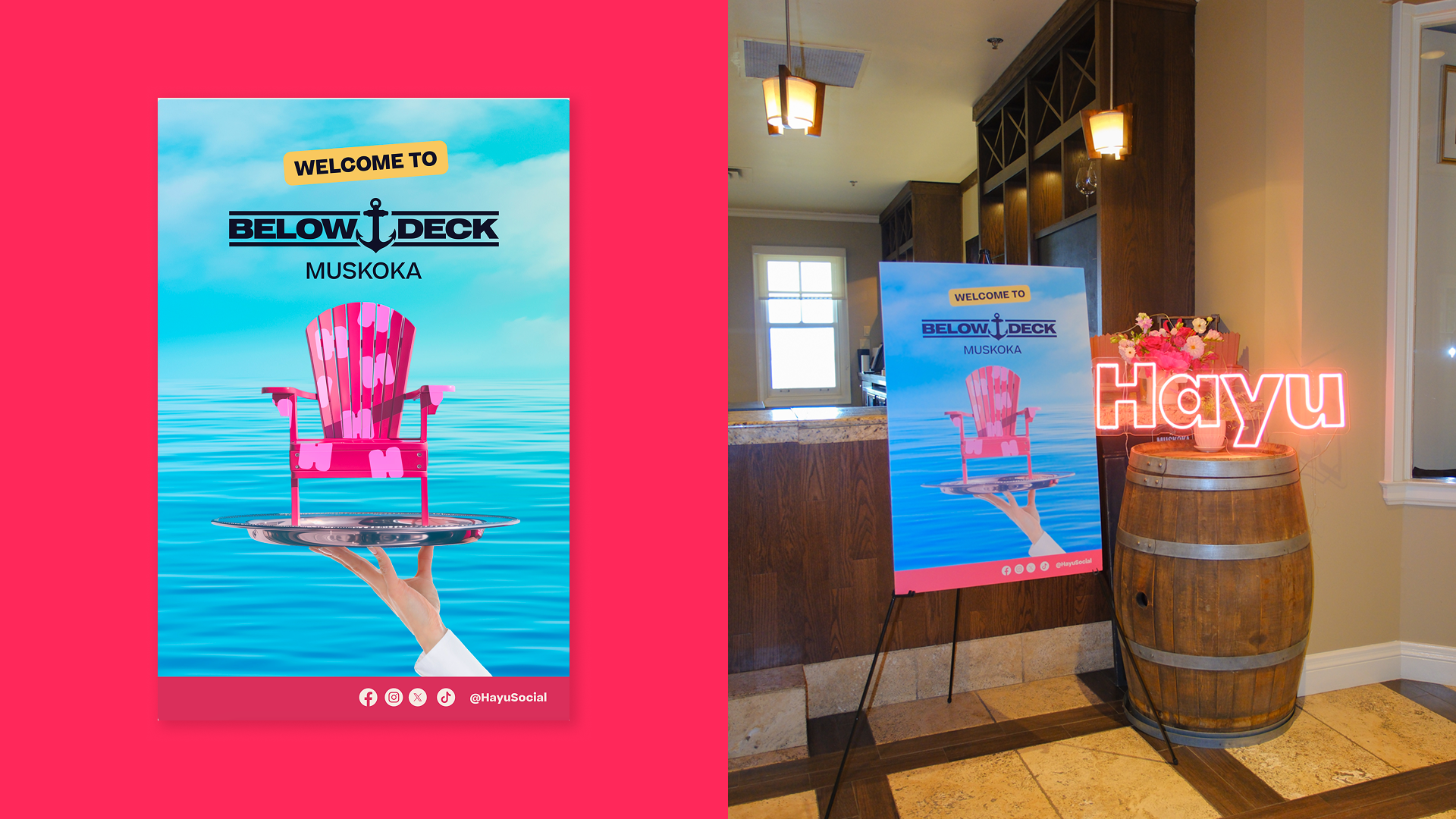As part of an influencer event to promote Hayu’s show Below Deck, we hosted a Muskoka cottage weekend where I designed an event identity with everything from custom invites and branded menus to large-scale activation backdrops to creating a cohesive, camera-ready environment for seven influencers.