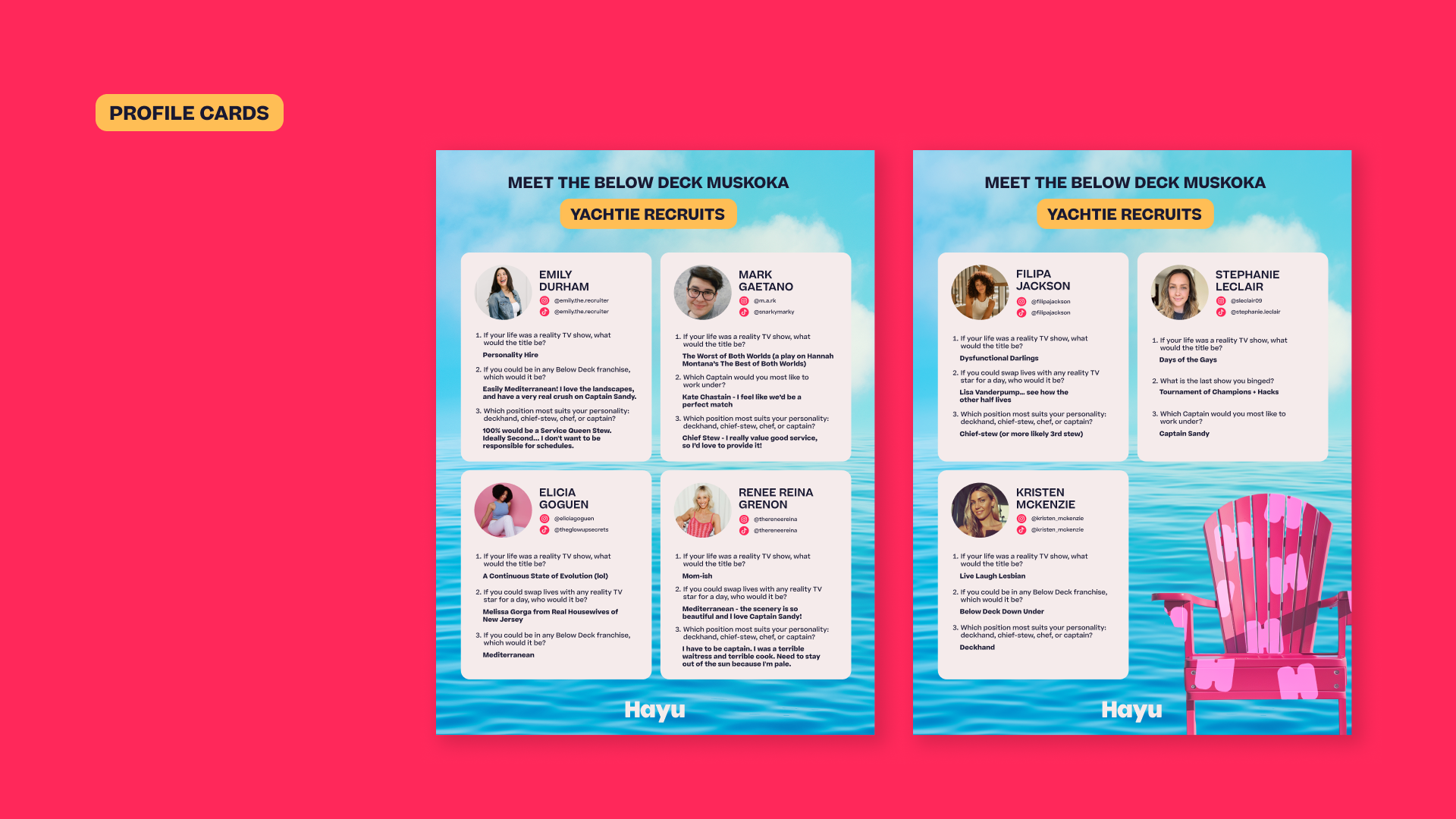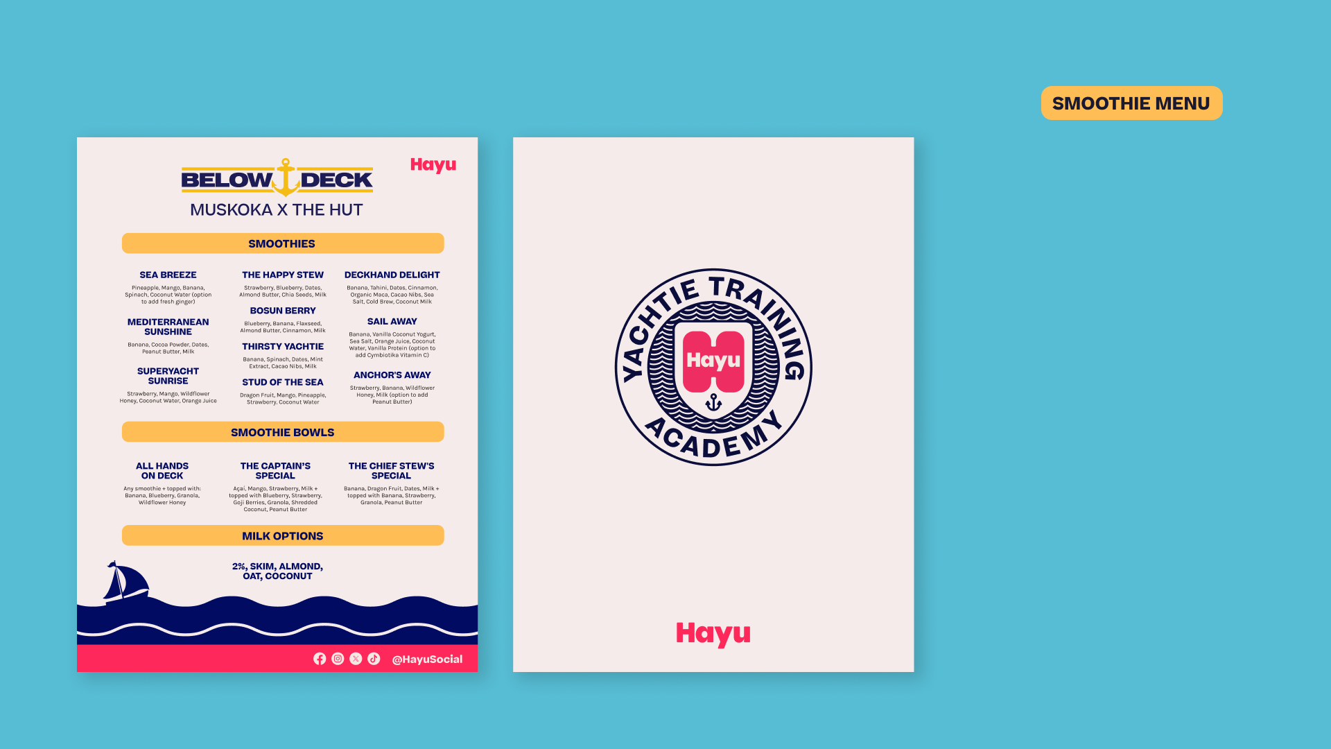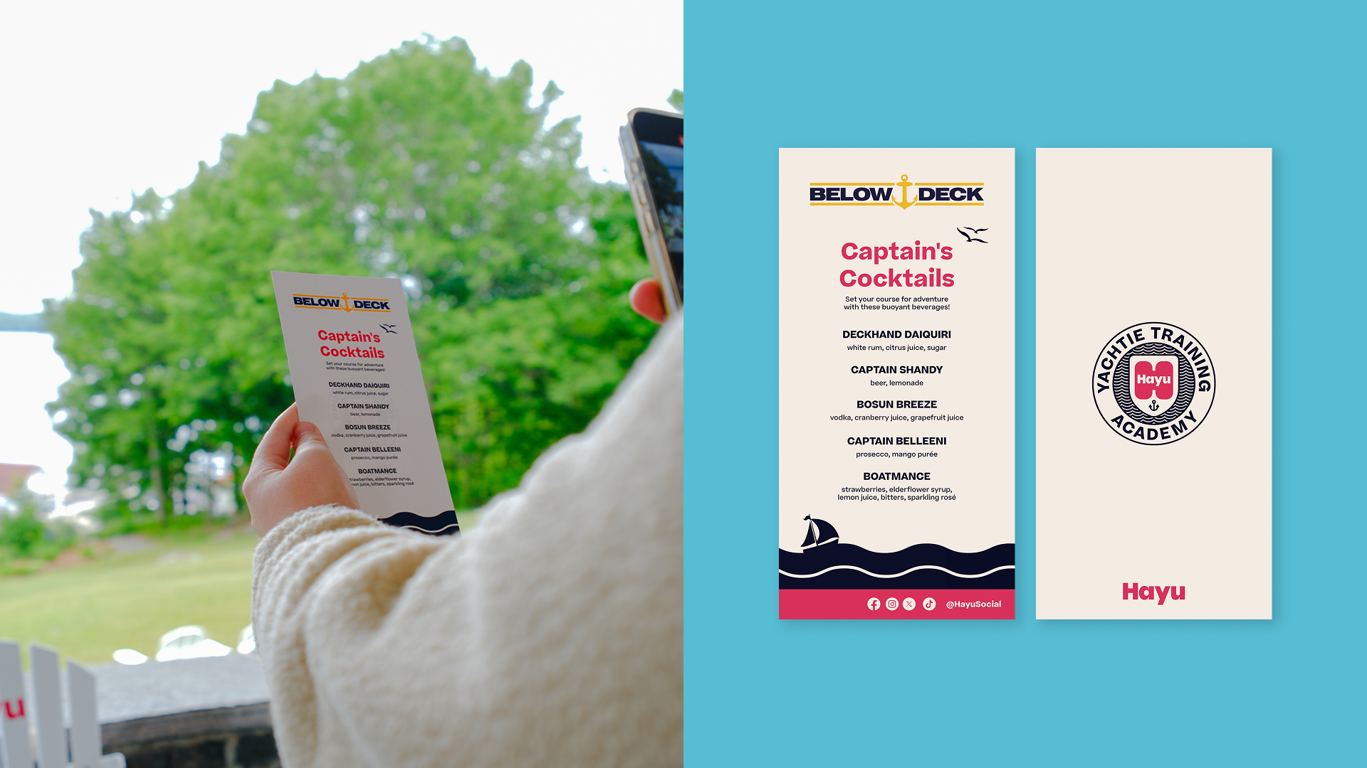 As part of an influencer event to promote Hayu’s show Below Deck, we hosted a Muskoka cottage weekend where I designed an event identity with everything from custom invites and branded menus to large-scale activation backdrops to creating a cohesive, camera-ready environment for seven influencers.